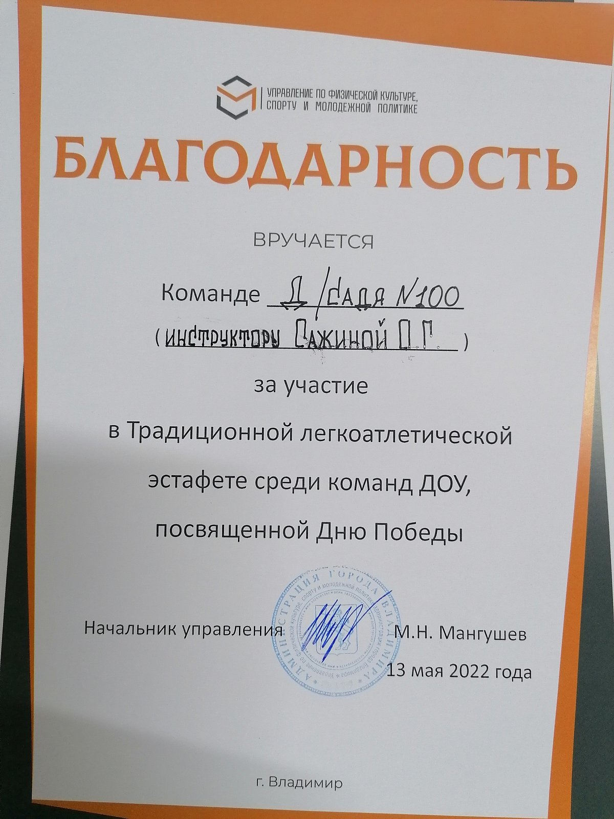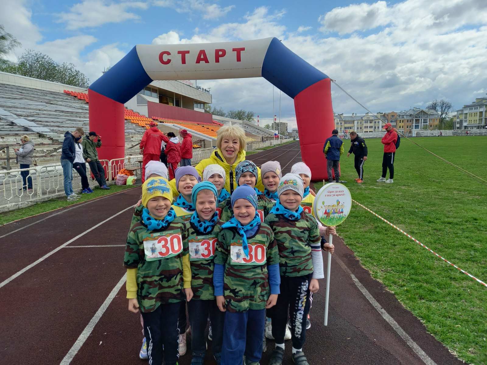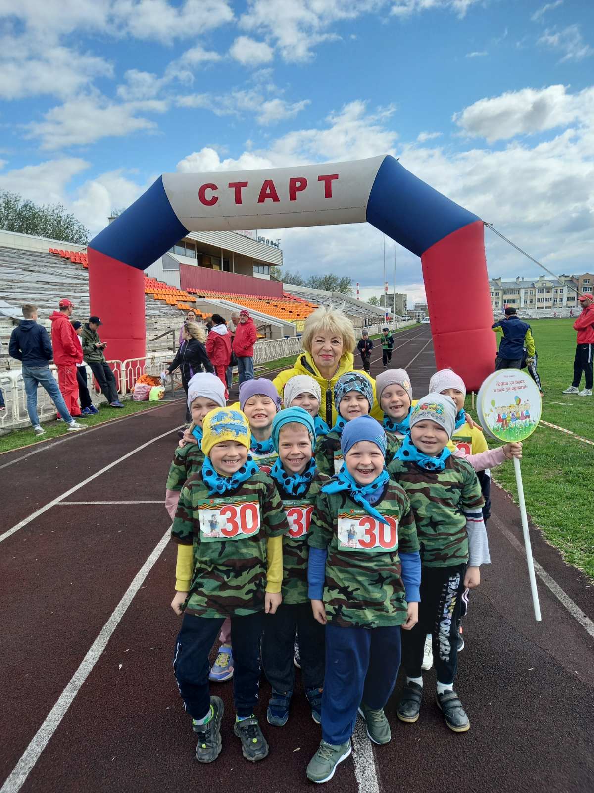 Воспитанники МБДОУ "ЦРР-детский сад №100" приняли участие в Традиционной легкоатлетической эстафете среди команд ДОУ г. Владимира, посвященной Дню Победы. Всего в соревнованиях на стадионе "Лыбедь" приняли участие 58 команд, это около 500 ребят! Они проходили эстафету в 8 этапов, слаженно работали в команде и поддерживали друг друга. Наши дети проявили активное участие и очень стремились к победе, в итоге стали вторыми в своём забеге.