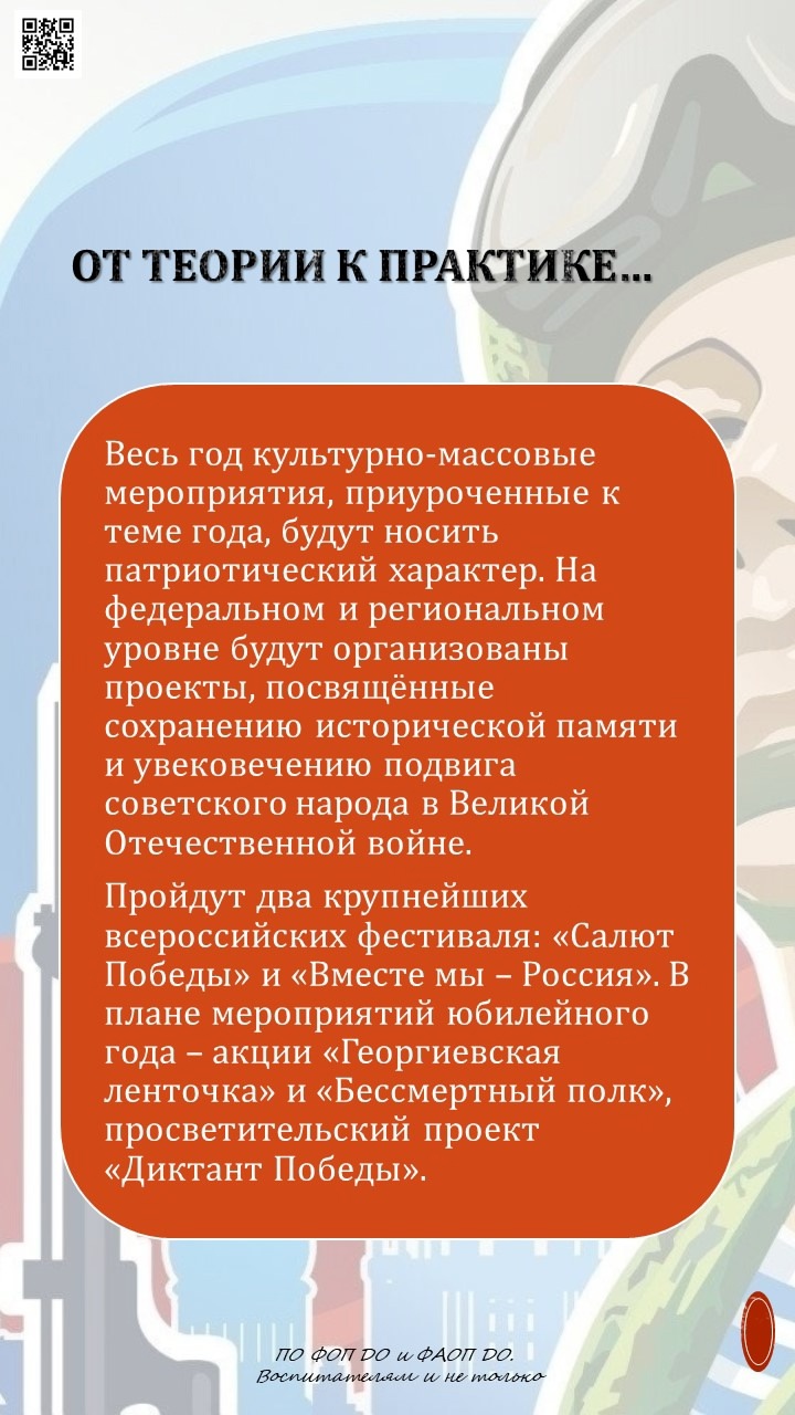 Весь следующий год культурно-массовые мероприятия, приуроченные к теме года, будут носить патриотический характер. На федеральном и региональном уровне будут организованы проекты, посвящённые сохранению исторической памяти и увековечению подвига советского народа в Великой Отечественной войне.