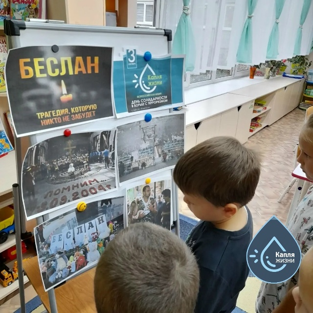 Этот день приурочен к трагическим событиям, произошедшим в первые сентябрьские дни 2004 года в г. Беслане. Тогда, во время террористического акта, погибли несколько сотен человек, большинство из которых были дети. Все три дня, находясь в заточении, они не могли выпить и капли воды. Через акцию «Капля жизни» мы призываем символически поделиться водой с теми, кого уже с нами нет…Участникам акции предложено набрать воды в сложенные ладошки и полить цветы.