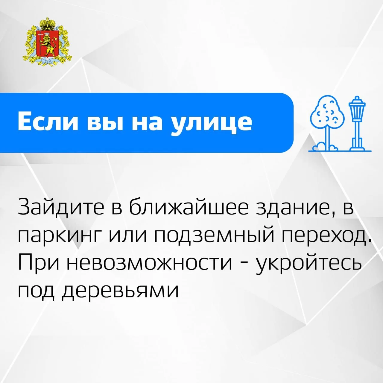 • В помещении: отойдите от окон, укройтесь в коридорах, подвалах. На нижних этажах многоэтажек безопаснее.