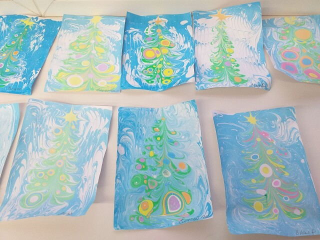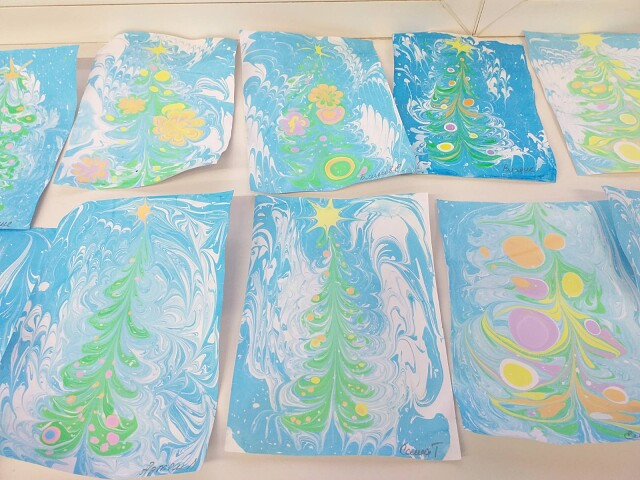 В старшей группе №7 прошел мастер-класс в технике эбру (рисование на воде). Ребята рисовали новогоднюю ёлочку. У каждого получилась своя неповторимая, оригинальная и очень красивая ёлочка. Дети и их родители были в восторге.